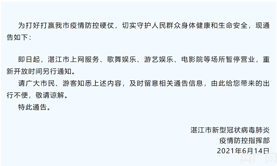 6月14日起 湛江全市娛樂(lè )場(chǎng)所暫停營(yíng)業(yè)