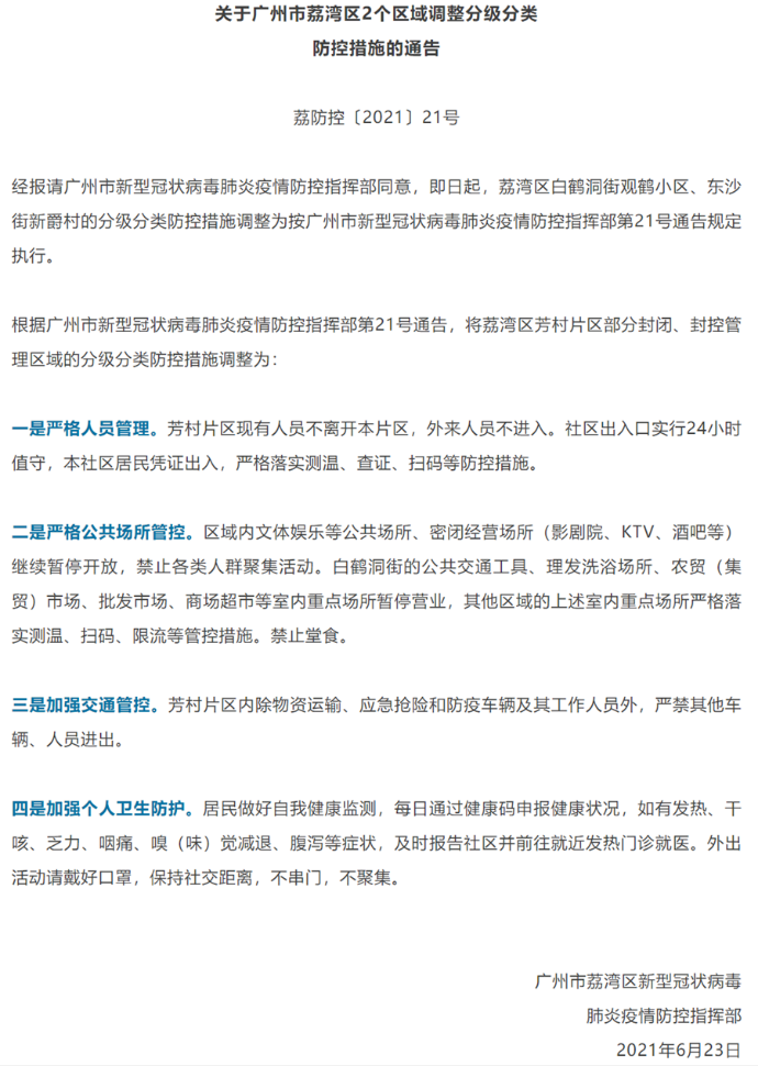 央廣網(wǎng)廣州6月23日消息(記者張勝強)6月23日,廣州市荔灣區新型冠狀病毒肺炎疫情防控指揮部發(fā)布通告,即日起,調整荔灣區白鶴洞街觀(guān)鶴小區、東沙街新爵村的分級分類(lèi)防控措施。