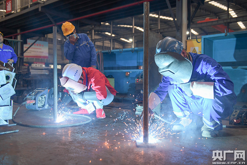 “技能?chē)帧迸c一線(xiàn)產(chǎn)業(yè)工人進(jìn)行焊接比拼。(央廣網(wǎng)記者 官文清攝)