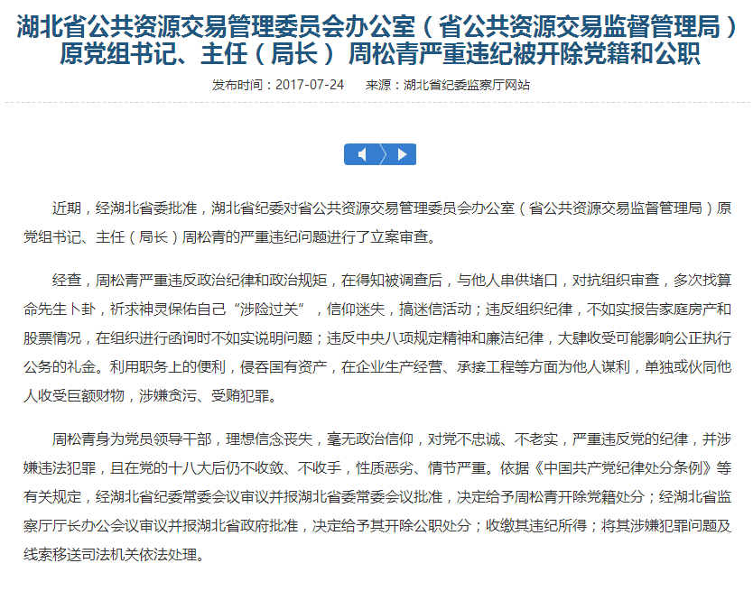 湖北省公共資源交易管理委員會(huì )辦公室(省公共資源交易監督管理局)原黨組書(shū)記、主任(局長(cháng)) 周松青嚴重違紀被開(kāi)除黨籍和公職