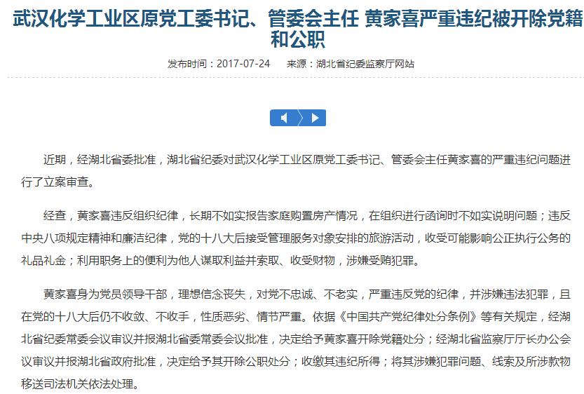 據湖北省紀委監察廳網(wǎng)站7月24日通報: