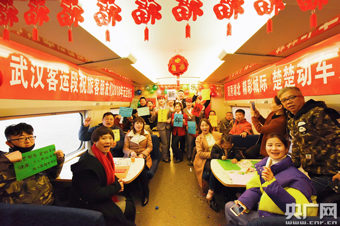 央廣網(wǎng)武漢12月31日消息(記者張毛清 黃炎秋 通訊員蘇杭 宋進(jìn)軍)“我希望今年我的孩子能考上理想的大學(xué)!”“我希望我可以找到一個(gè)女朋友!”“我希望我們的國家更加繁榮昌盛!”12月30日上午,在黃岡東開(kāi)往孝感東的C5342次列車(chē)上,武漢客運段舉行了慶元旦聯(lián)歡活動(dòng),動(dòng)姐與旅客共同寫(xiě)下新年愿望,相互祝福,迎接2018年的到來(lái)。