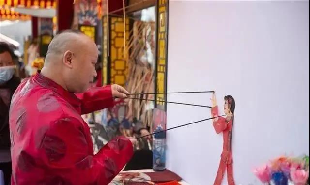 皮影戲匠人正在操縱皮影戲戲曲人物,吸引了不少市民游客前來(lái)圍觀(guān)。