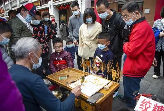 春節期間,在江岸吉慶街各式各樣的傳統民俗活動(dòng)吸引不少市民前來(lái)游玩。熙來(lái)攘往的吉慶街里,除了不少父母帶著(zhù)小朋友前來(lái)游玩感受體驗春節里的傳統民俗活動(dòng),也不乏情侶們踏春出游,感受濃濃春意。