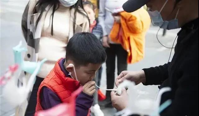 小朋友正在非遺匠人的指引下吹糖人。