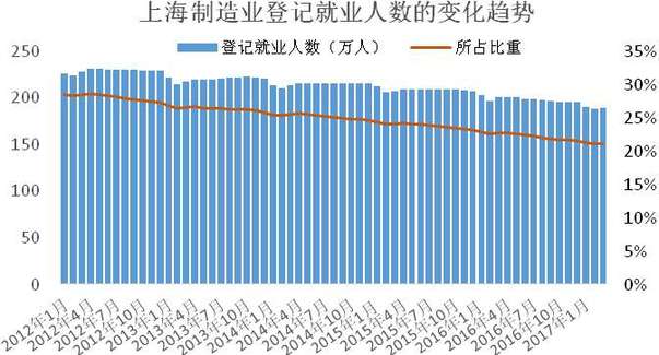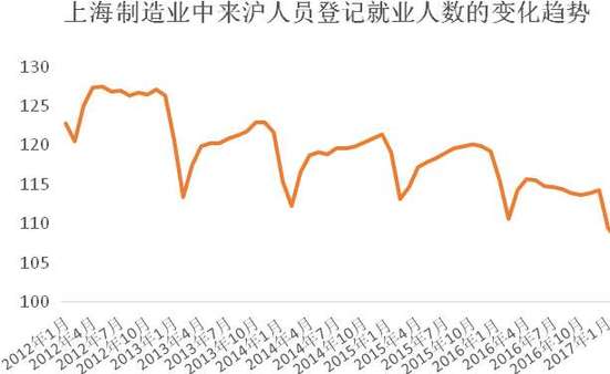 據介紹,2017年3月,上海制造業(yè)登記就業(yè)人數為189.8萬(wàn)人,同比減少5.3%。其中,外省市來(lái)滬人員共110.3萬(wàn)人,與五年前同期水平相比累計減少14.8萬(wàn)人,下降幅度為11.8%。從近年來(lái)的變化趨勢看,上海制造業(yè)登記就業(yè)人數總體呈現震蕩下行的趨勢。制造業(yè)登記就業(yè)人數占上海登記就業(yè)總人數的比重,也從2012年3月的28.4%,下降到2017年3月的21.2%。
