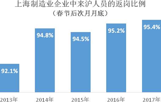 統計數據顯示,上海制造業(yè)登記就業(yè)人員的平均就業(yè)期限為30.4個(gè)月,與2012年同期相比上升8.6個(gè)月;平均年齡為36.7歲,比2012年同期高1.7歲,其中高學(xué)歷勞動(dòng)者越來(lái)越多。2017年3月,上海制造業(yè)登記就業(yè)人員中,大專(zhuān)以上學(xué)歷的約占23.0%,同比上升1.2個(gè)百分點(diǎn),與五年前同期水平相比上升5.8個(gè)百分點(diǎn)。