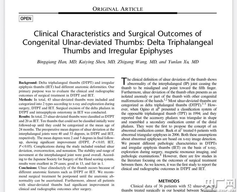 央廣網(wǎng)上海4月12日消息(記者楊靜 通訊員姜蓉)近日,國家兒童醫學(xué)中心(上海)、上海交通大學(xué)醫學(xué)院附屬上海兒童醫學(xué)中心骨科副主任醫師徐蘊嵐團隊正式公布一項最新臨床創(chuàng )新成果——一種關(guān)于拇指尺偏畸形的新型手術(shù)矯正方法。該項成果近期已于《Journal of Pediatric Orthopaedics》發(fā)表,該雜志是北美兒童骨科協(xié)會(huì )官方雜志、國際兒童骨科領(lǐng)域頂尖專(zhuān)業(yè)標桿期刊,該文章也是近十年來(lái)上海小兒骨科專(zhuān)業(yè)領(lǐng)域首次被其收錄的研究成果。