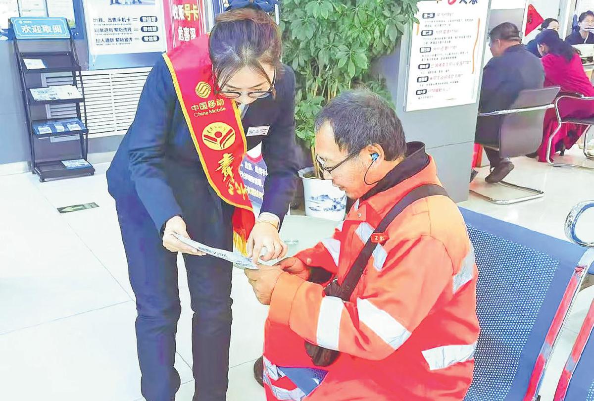 網(wǎng)點(diǎn)營(yíng)業(yè)廳工作人員開(kāi)展反詐宣傳(中國移動(dòng)山西公司供圖)