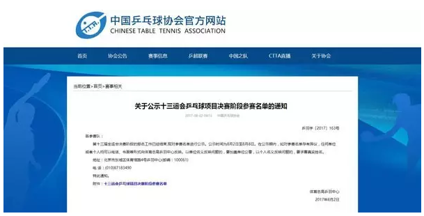 8月2日,國家體育總局乒羽中心在中國乒乓球協(xié)會(huì )網(wǎng)站上公示了8月將在天津舉行的第十三屆全運會(huì )乒乓球項目參賽名單。