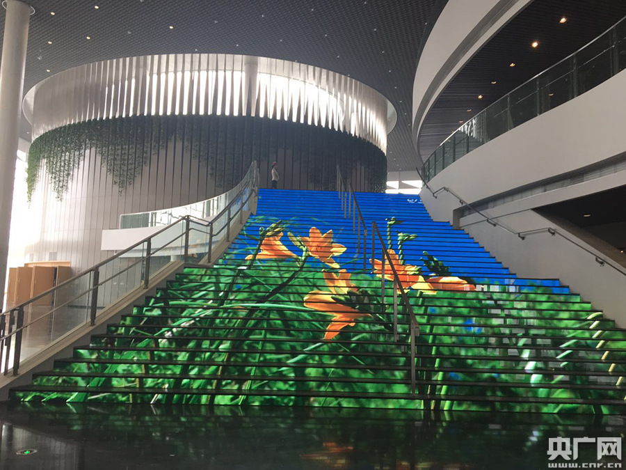 除了穹幕影院,演藝中心的設計也結合了諸多高科技元素!笆弧敝笫忻褡呷肫渲,會(huì )看到一個(gè)“發(fā)光樓梯”,這是演藝中心的一大特色。該樓梯為L(cháng)ED顯示屏樓梯,3部分共37級臺階,可分別顯示圖像也可合成一個(gè)屏幕播放,既可以顯示各種文字、圖片、視頻,也可以與現場(chǎng)攝像機無(wú)縫聯(lián)接,實(shí)況直播,效果令人耳目一新。
